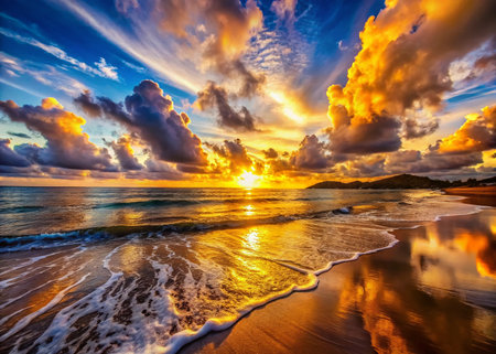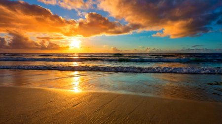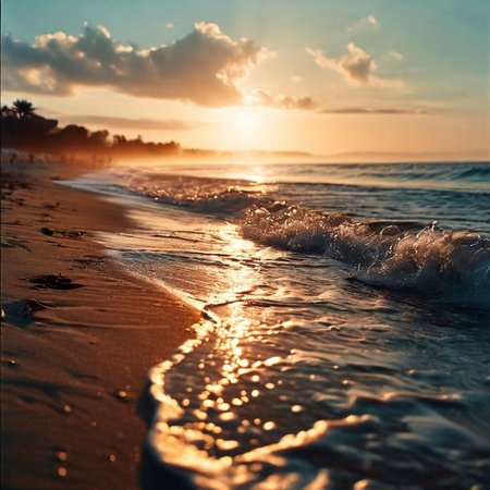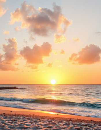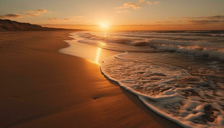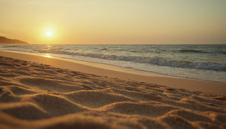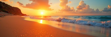 Stunning sunset over a tranquil beach. Golden hour light bathes the sand and waves.