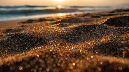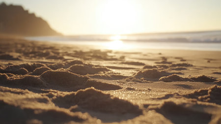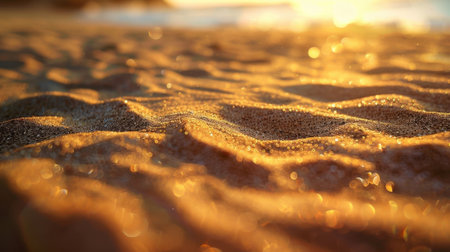 Warm golden sand shows texture as sunlight casts a glow, creating an inviting feel on this beach at sunset with a gentle breeze.