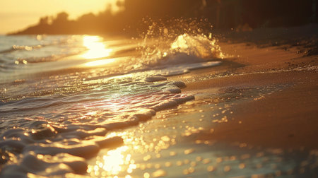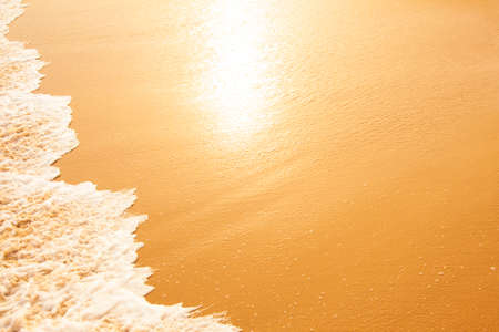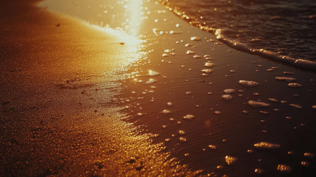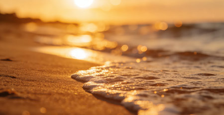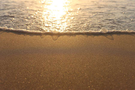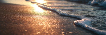 A close-up of golden sand with foamy ocean waves washing ashore under the warm sunset light. A quiet summer vacation moment. Space for text on blurred areas and sky.
