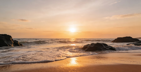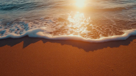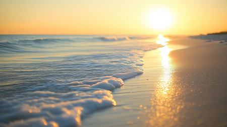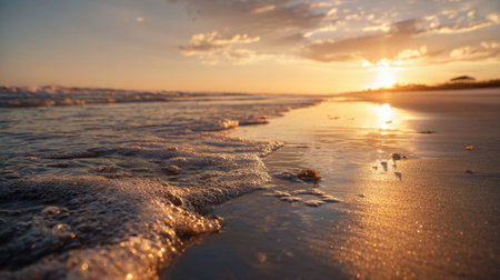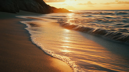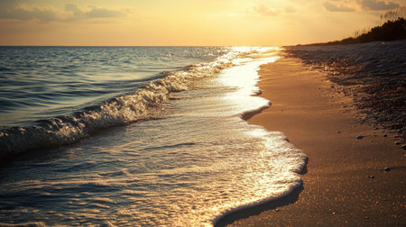 This stunning image captures a serene beach at sunset, showcasing gentle waves lapping at golden sand, reflecting warm light for a tranquil coastal atmosphere.