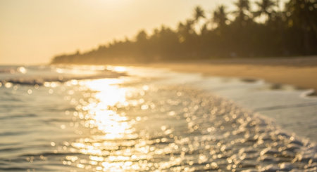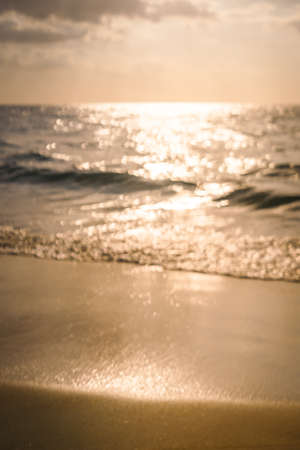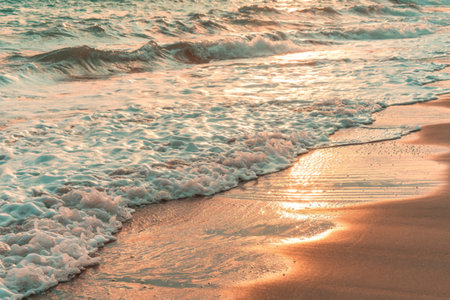 Blur background of sea waves hit the coast causing white bubbles and splashes of water. The orange color glow of the sunset creates warm tones. Sandy beaches with glistening. There is copy space.