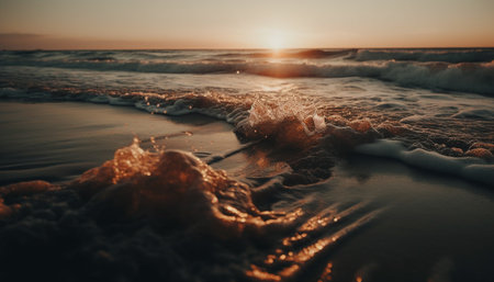 Tranquil seascape at dusk waves breaking on wet sand, reflecting beauty generated by artificial intelligence