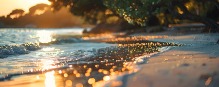 Soft waves roll onto a pristine sandy beach under the warm glow of the setting sun, creating a serene atmosphere. The water sparkles, reflecting the golden hues of dusk.