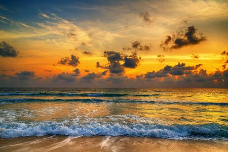 Beautiful sunset on the beach. Seascape with ocean waves.