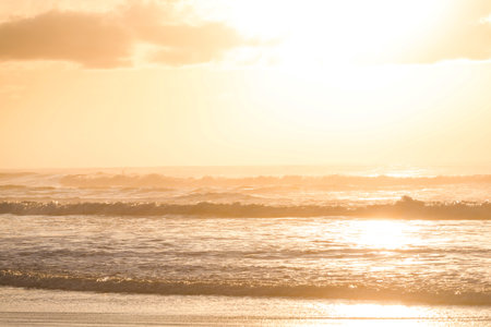 Experience the serene beauty of a sunset over gentle ocean waves, where soft sand meets the coastline. The warm gold and orange tones create a peaceful atmosphere perfect for relaxation and reflection.