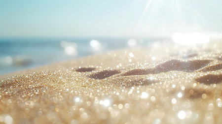 Glistening sand texture creates a sparkling effect on a sunny beach with footprints near the tranquil ocean and clear blue sky. Summer vibe and peaceful coastal atmosphere.