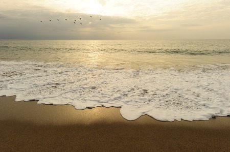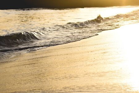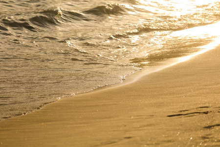 Sea waves and warm sunset light, calm and relaxing sandy beach