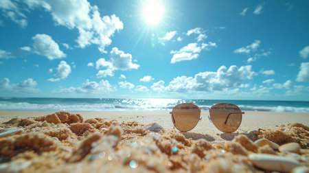 A pair of sunglasses is placed on top of a sandy beach, blending with the grains of sand that stretch towards the ocean.