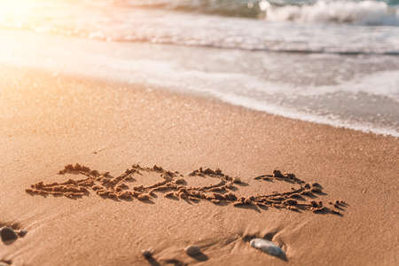 2022 figures on sandy beach Happy New Year 2022, number hand written in the golden sand on beautiful sunset golden light. The sea wave washes away the inscription 2022 on the yellow sand close-up.