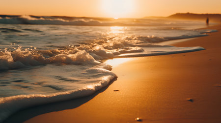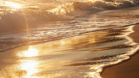 This stunning image captures serene waves gently rolling onto a sandy beach during sunset, with soft sunlight casting a golden glow on the water.