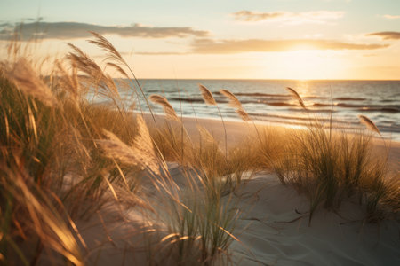 Serene Beach Scene with Soft Dunes and Sunlit Grass at Sunrise on a Tranquil Morning by the Ocean Shore