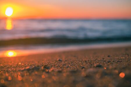 Beautiful sunset on the beach. Sea waves. Soft focus.