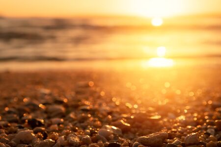 The sun lights are reflected in the waves at sunset. Impressive beach view with golden tones. Holiday concept and background.
