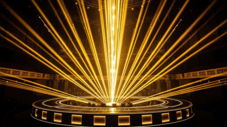 This image captures a vibrant and dynamic stage illuminated by a dazzling array of golden spotlights. The beams of light converge in a spectacular burst, creating a mesmerizing visual effect. The stage is adorned with intricate designs and patterns, adding to the overall grandeur of the scene. The lighting design suggests a high-energy performance, possibly a concert or theatrical production, highlighting the importance of stage lighting in enhancing the overall experience.