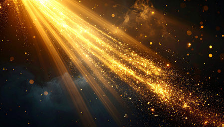 A diagonal golden light beam cuts across a dark gradient background, filled with sparkling particles and soft bokeh effects.