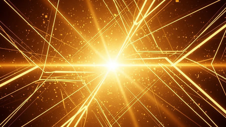 An abstract golden geometric network of lines and small squares radiates from a brilliant central light source, suggesting a futuristic digital or energy concept.