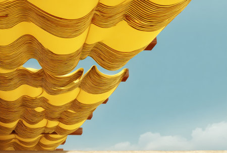 Abstract, yellow fabric waves undulate beneath a cloud-speckled blue sky