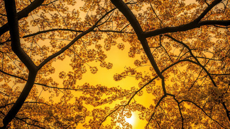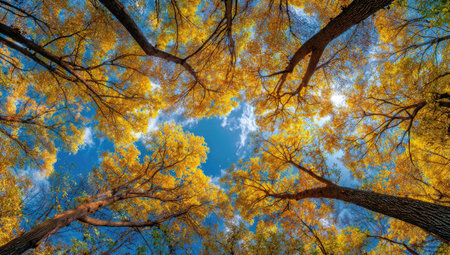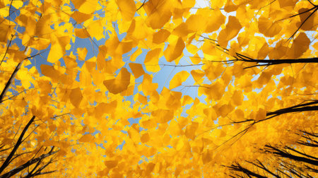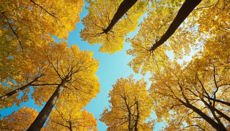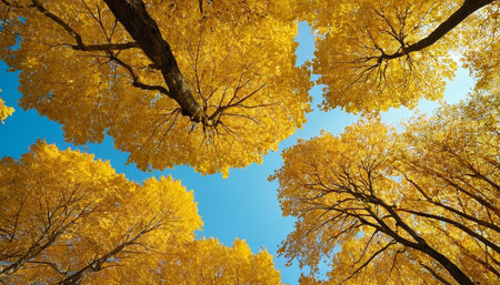 captures a striking upward view of autumn trees against a vivid blue sky. The dominant color is a rich golden yellow from the abundant leaves, interspersed with the dark silhouettes of tree trunks and branches. The perspective emphasizes the upward reach of the trees, creating a sense of awe and wonder. The clear sky suggests a crisp, pleasant autumn day. The composition highlights the intricate patterns formed by the branches and the texture of the foliage, offering a visually engaging...