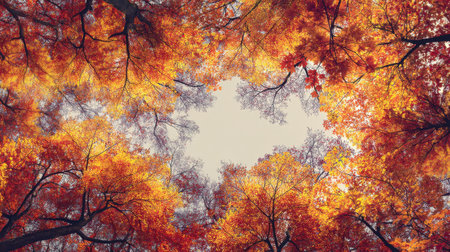 Experience the breathtaking beauty of a vibrant autumn canopy, where warm shades of orange, red, and yellow leaves gently frame a clear sky in a tranquil forest.