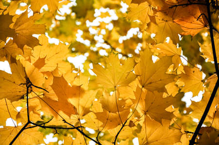 Autumn in the park: golden maple tree leaves in the sunlight