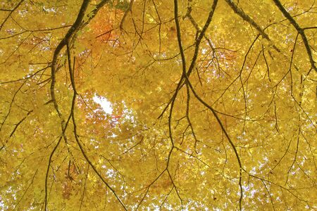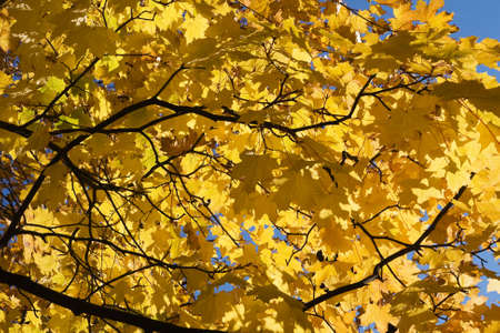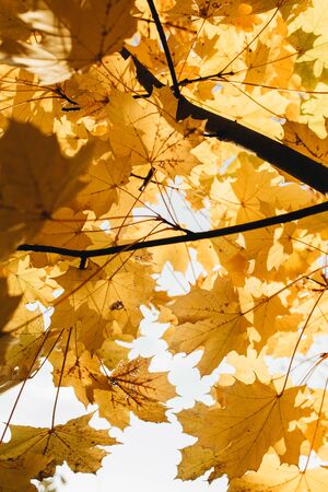 Yellow-orange maple leaves in the crown of a tree, view from below. Autumn maple leaves.