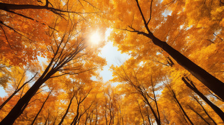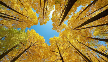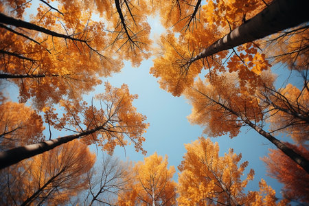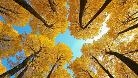 An immersive upward view into a forest during the autumn season, showcasing a display of yellow and orange foliage. The vibrant leaves create a warm, glowing canopy against a clear, expansive blue sky. The strong lines of the tree trunks and branches lead the eye upwards, emphasizing the height and density of the forest. captures the essence of fall, with its rich colors and the serene beauty of nature's transformation.