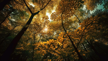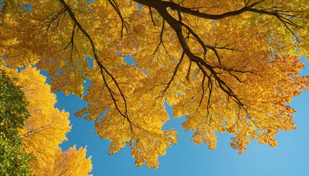 Majestic tree with vibrant golden yellow autumn leaves viewed from below, showcasing beautiful fall season nature transformation.