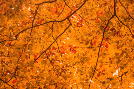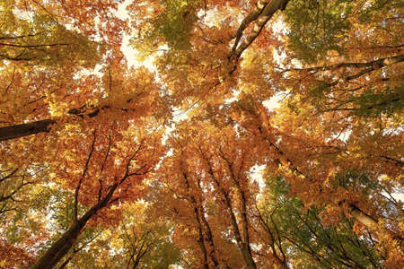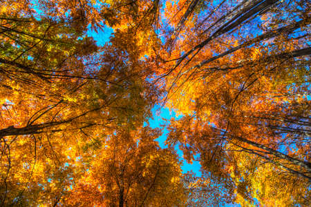 Perspective up view of autumn forest with bright orange and yellow leaves. Dense woods with thick canopies in sunny fall weather.