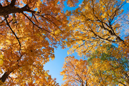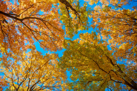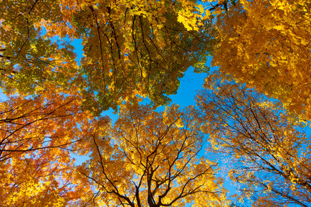 View from below of tops of autumn trees in forest at blue sky, seasonal nature scenery. Fall scene of trees in wood at sunlight, colorful foliage. Autumn season backgrounds concept. Copy ad text space