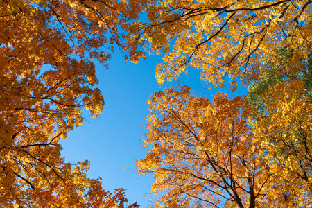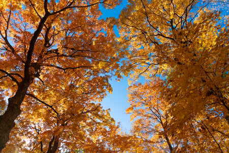 An upward perspective captures tree branches with vibrant yellow and orange foliage against a bright blue sky. The sunlight filters through the leaves creating a warm and inviting atmosphere. Suitable for use in various visual media, including nature-themed projects, educational resources, or advertising campaigns.