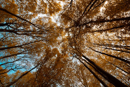 Autumn trees in the forest, panoramic view from below