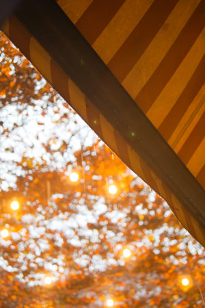 Outdoor dining canopy with autumn lights in cozy atmosphere