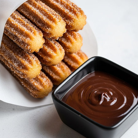 Golden-Brown Churros with Cinnamon Sugar and Rich Chocolate Sauce in Cozy Café Ambiance