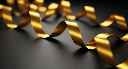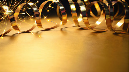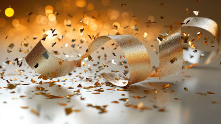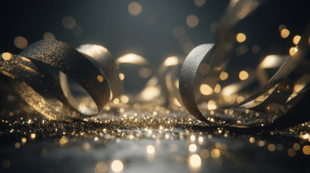 Shimmering golden ribbons twist gracefully in the air, surrounded by sparkling confetti and soft bokeh lights, perfect for adding a festive touch to celebrations.