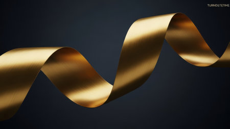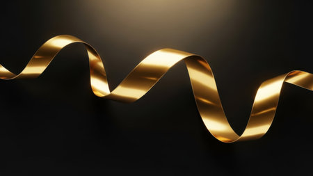 A golden ribbon gracefully curves against a dark background, illuminated by a soft, warm light. The ribbon's metallic sheen catches the light, creating a striking contrast with the surrounding darkness.