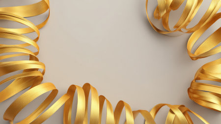Golden ribbon curls create elegant frame on soft beige background, perfect for festive occasions or gift wrapping. shiny texture adds touch of luxury and celebration