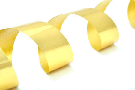 A collection of golden curled ribbons arranged in a circular pattern against a white background.
