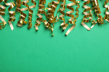 Shiny golden serpentine streamers on green background, flat lay. Space for text