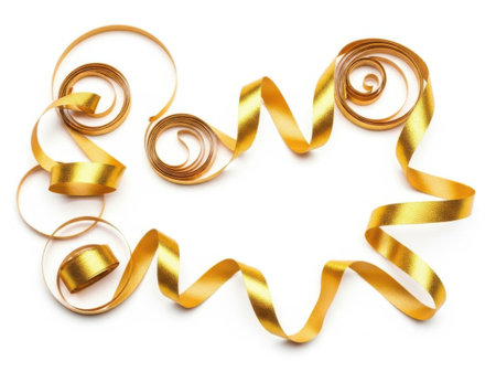 A vibrant arrangement of golden glitter ribbon intertwined with shimmering sequins on a clean white background, perfect for festive celebrations and joyful events.