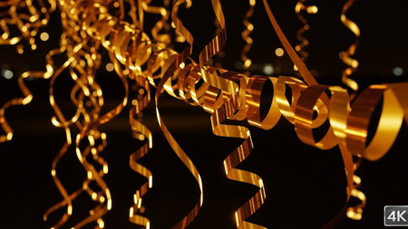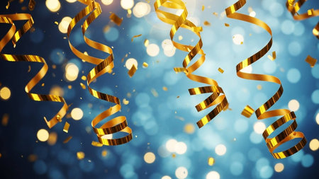 A mesmerizing display of glimmering gold streamers and sparkling confetti fills the air, evoking a joyous and festive atmosphere perfect for celebrations and special events.