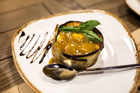 Jelly mousse cake covered with orange glaze. Sweet decorated of green leaf.