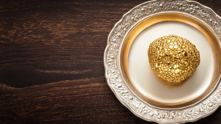 A stunning shiny gold decorative object rests on an elegant silver plate against a dark wooden background, radiating luxury and sophistication.