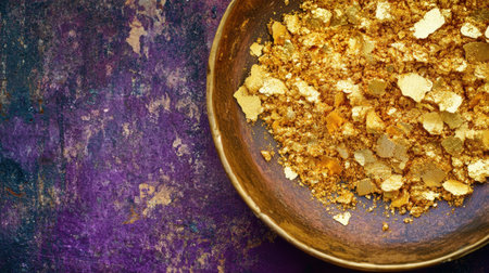A stunning image showcasing golden flakes in a rustic wooden bowl positioned on a vibrant textured background. Perfect for culinary and artistic inspirations.