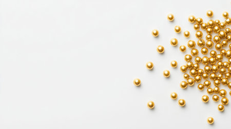 A collection of golden decorative beads scattered on a clean white surface, ideal for various creative projects, jewelry making, and elegant designs.