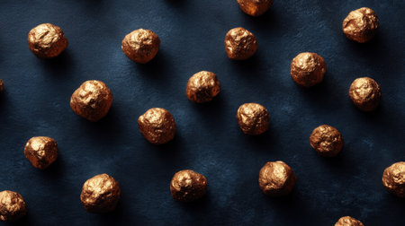 A stunning display of golden chocolate treats scattered on a dark surface, creating a tempting visual appeal that enhances any festive occasion or celebration.