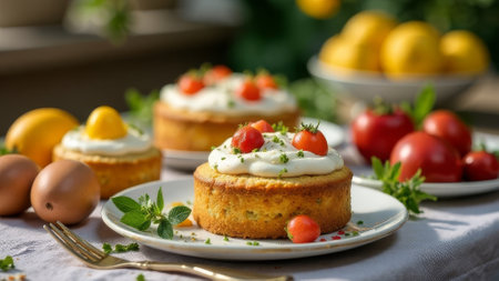 Homemade Easter cake decorated with fresh berries and mint, served on a rustic wooden table with eggs, butter, and fruits. A festive cozy atmosphere perfect for spring celebrations and gatherings