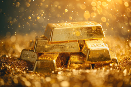 A stunning close-up image showcases beautifully stacked gold bars, radiating wealth and opulence, set against a soft blue background with sparkling dust.