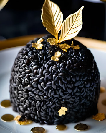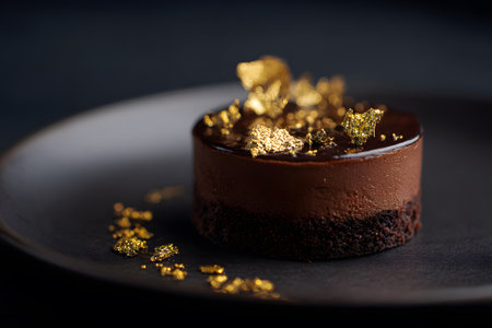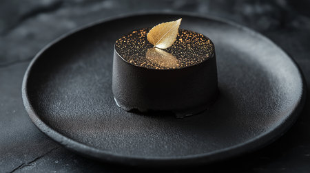 Close-up shot of a decadent chocolate dessert adorned with edible gold flakes, elegantly presented on a black plate. The rich, smooth texture and luxurious presentation are perfect for showcasing high-end desserts, gourmet food, or fine dining concepts. Ideal for menus, blogs, or culinary publications.