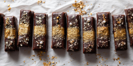 Luxury chocolate bars with gold leaf decoration and edible pearls, top down wide shot