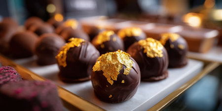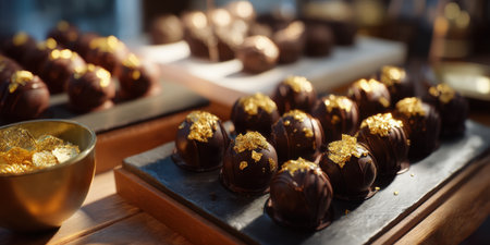 Luxury chocolate truffle display with gold leaf garnish slate tray, elegant dessert presentation